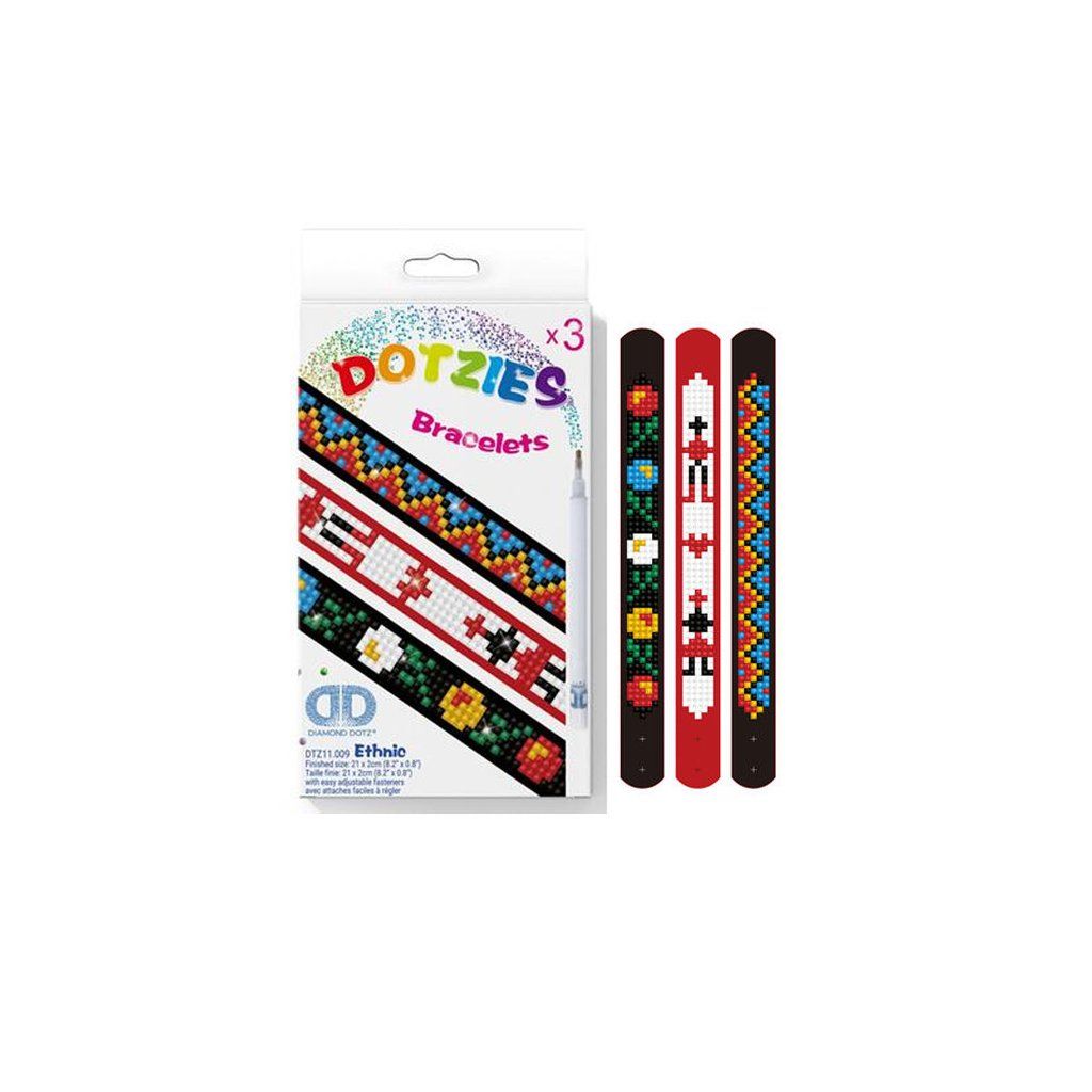Náramky etnické vzory, balení obsahuje 3x náramek se suchým zipem na upevnění na ruku, diamanty roztříděné dle barev, voskovou hmotu, stylus s měkkou rukojetí, zásobník na třídění diamantů a barevný tištěný návod. Velikost náramku je 21x2cm. Vhodné pro děti od 6 let.Doplňkové parametry