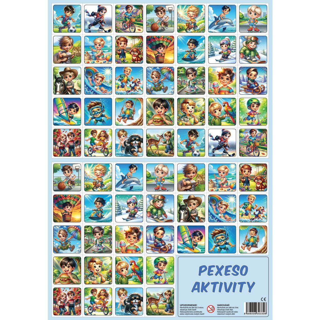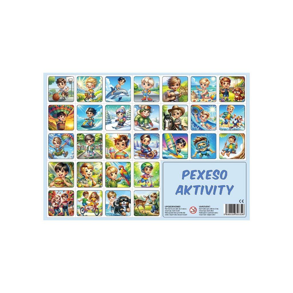 Společenská hra pexeso Aktivity, při které si děti hravou formou trénují svou paměť. Hra se po rozstříhání skládá z 32 obrázkových dvojic. Pexeso 32 dvojic s obrázky dětských aktivit.