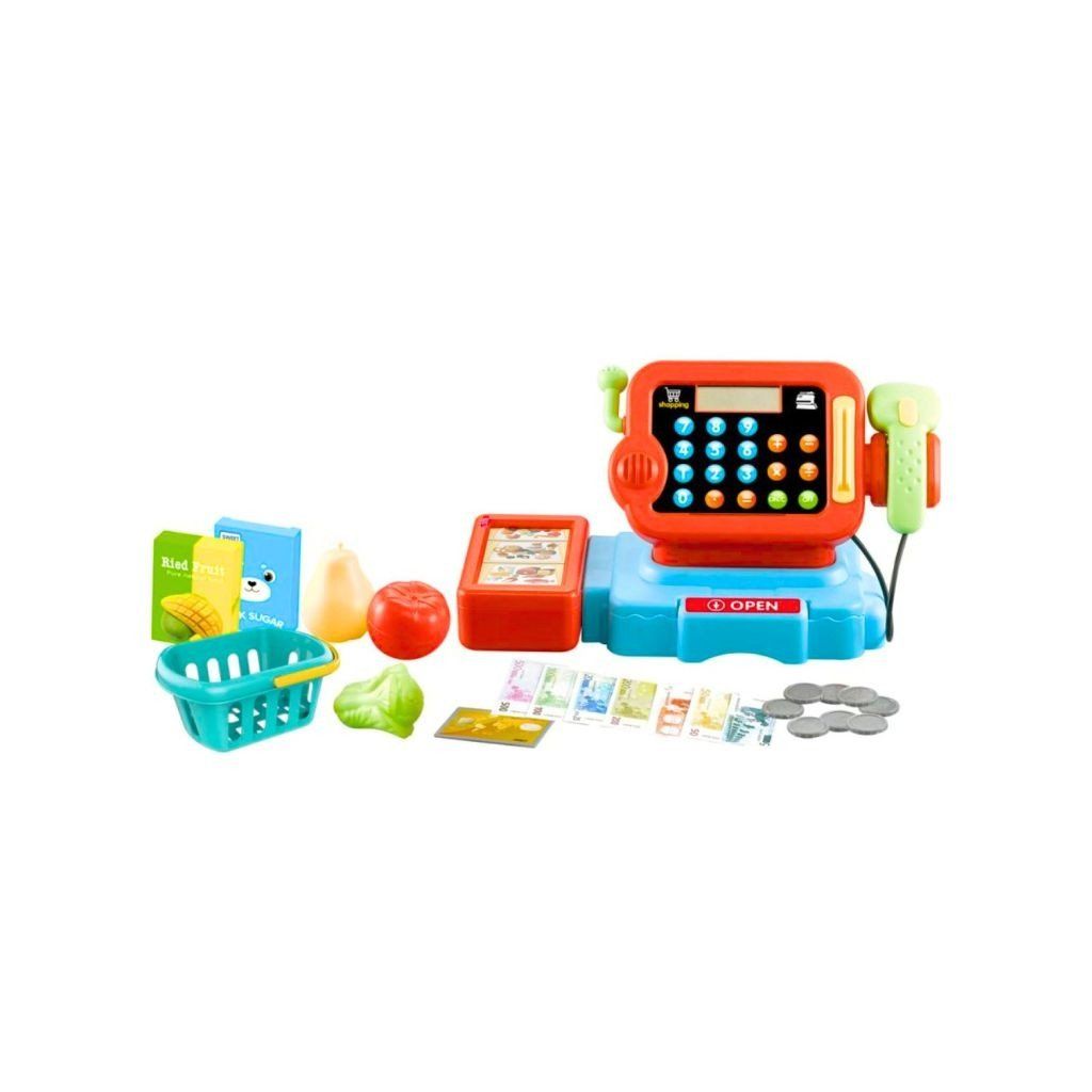 Dětská elektronická pokladna s LCD displejem je skvělá hračka pro malé prodavače a obchodníky, obsahuje nákupní košík, makety potravin, pokladnu s kalkulačkou, čtečku se světelnými a zvukovými efekty, kreditní kartu, papírové bankovky a plastové mince, děti si mohou procvičovat základní počítání a vytvářet realistické scénáře. nejsou součástí balení.Doplňkové parametry