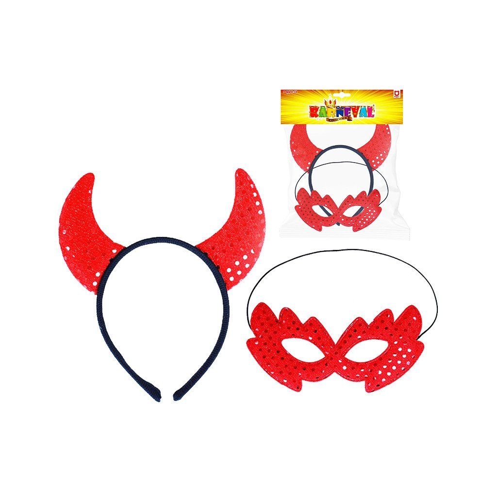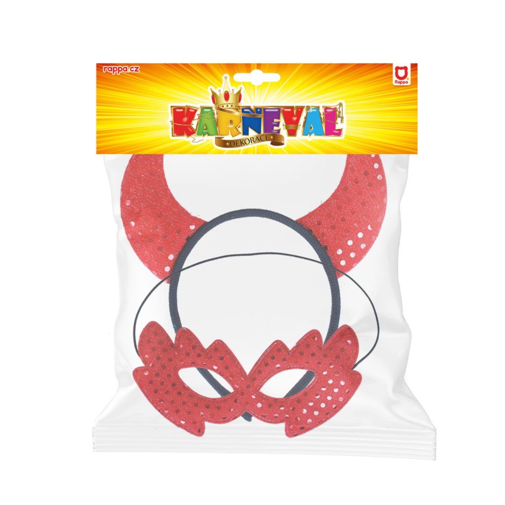 Sada čertice rohy a škraboška, balení má rozměry 220×230×30 mm. Cena je za rohy a škrabošku. Vhodné pro děti 3+.