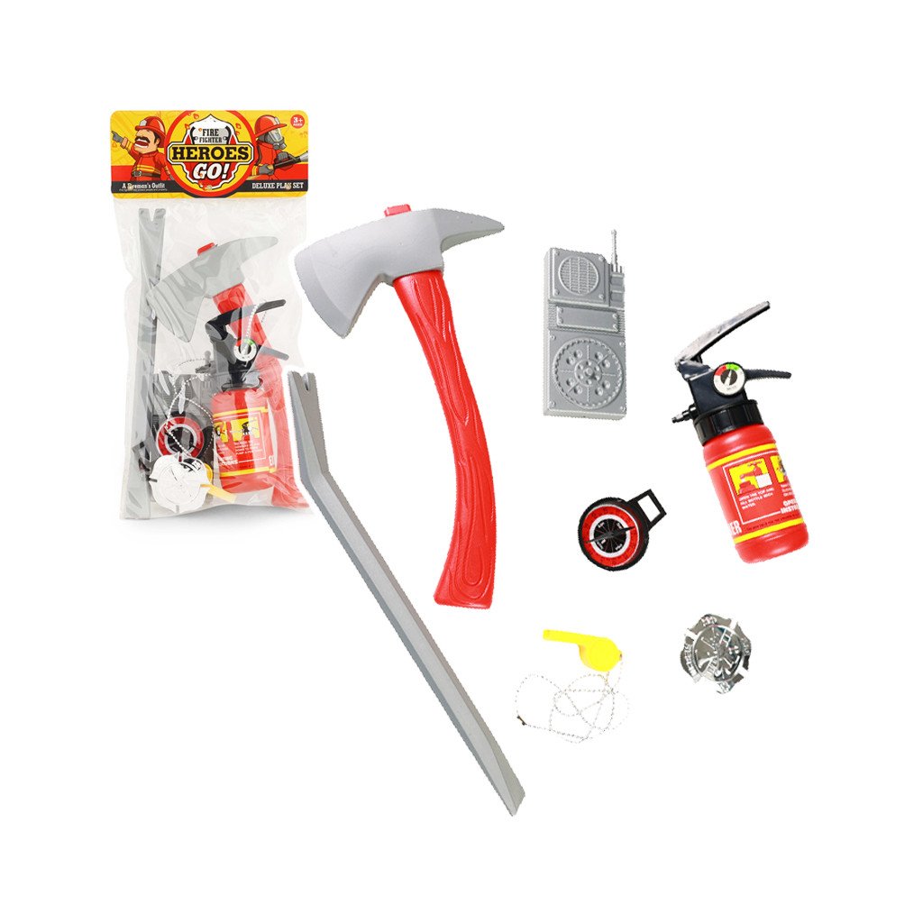 Sada Hasič s doplňky, sada obsahuje sekeru, hasicí přístroj, vysílačku, píšťalku, páčidlo, odznak a kompas. Do hasicího přístroje lze napustit vodu a stříkat. Cena je za sadu. Vhodné pro děti 3+.Doplňkové parametry