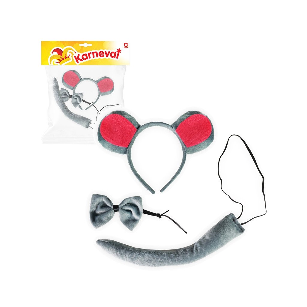 Sada Myš, balení má rozměry 26 x 23 cm a obsahuje ocas na gumičku, motýlka a čelenku s ušima. Cena je za kus. Vhodné pro děti 3+.
