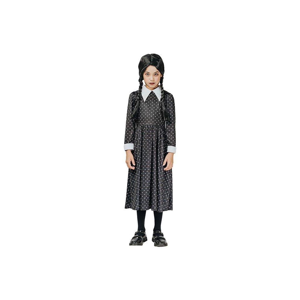 Slušivý karnevalový kostým s motivem gotické dívky v černé barvě ve velikosti S je určen pro holky ve věkovém rozmezí 4 - 6 let (110 - 120 cm).
