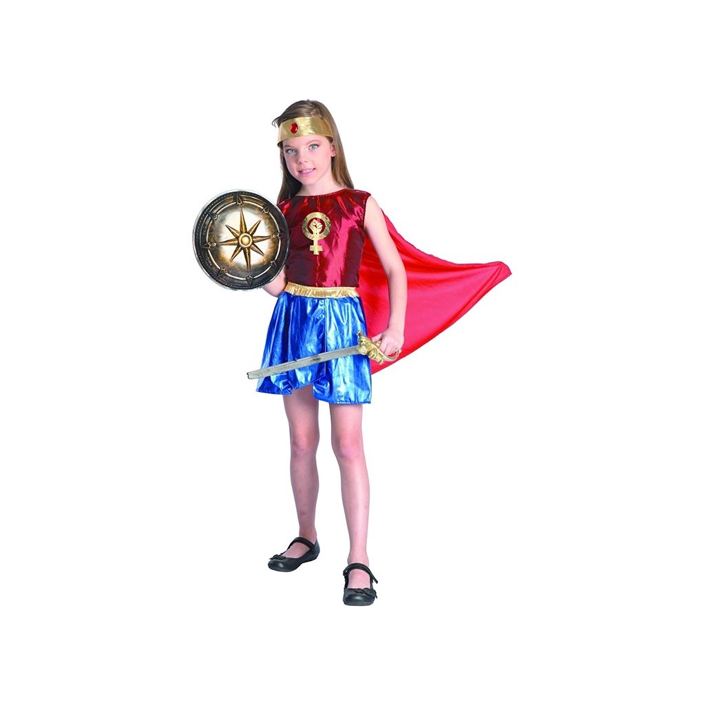 Šaty na karneval pro dívky- Hrdinka, 110 - 120 cm. Kostým je vhodný pro dívky ve věku 4-6 let. Balení obsahuje: -tričko -sukni -plášť -čelenku