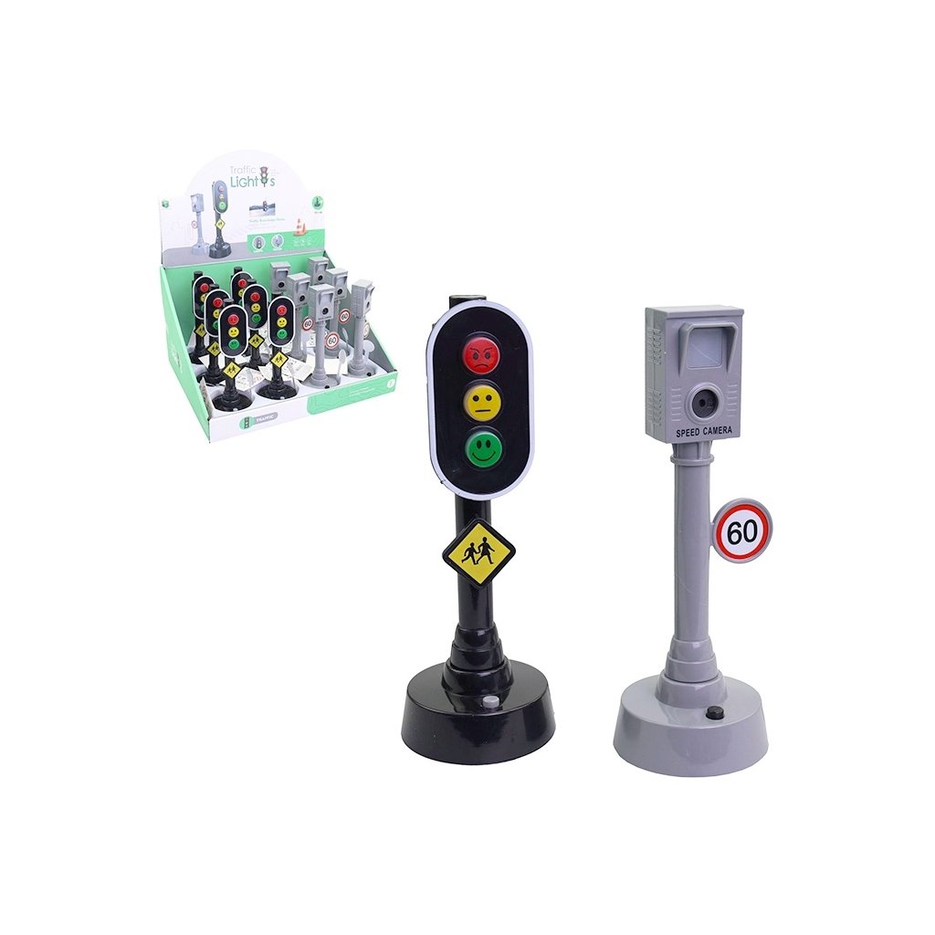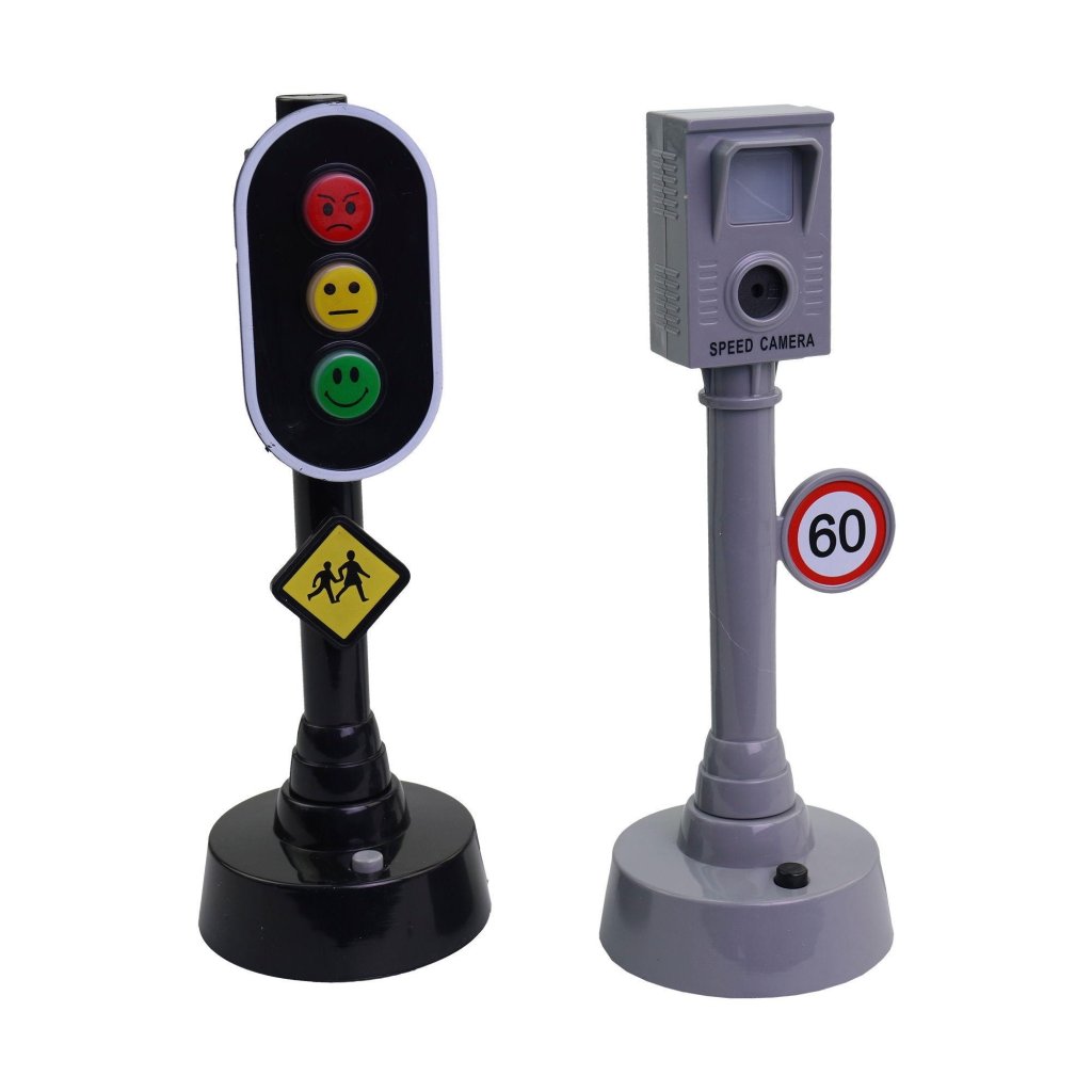 Semafory jsou černé a na jejich malých světélkách jsou namalovány minifigurky, které symbolizují možnosti přechodu přes průchod pro chodce. Stisknutím tlačítka se světlo zapne. Rychlostní fotoaparát s nápisem 60km rychlostní limit, je šedé barvy a má světelné a zvukové efekty, které napodobují skutečné snímání. Hračka je skvělou pomůckou pro výuku a seznamování dětí s pravidly bezpečnosti silničního provozu. Rozměr semaforu, fotoradaru je 15cm. Určeno pro děti ve věku 3+.Doplňkové parametry