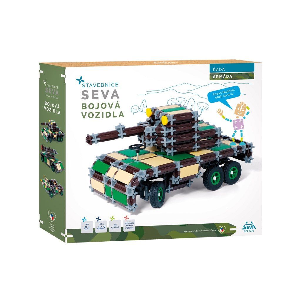 Stavebnice ve vojenských maskovacích barvách pro malé dobrodruhy a bojovnice. Postav děla, tanky, obrněné vozy nebo jinou vojenskou techniku podle svojí fantazie. Pevnost výtvorů můžeš prověřit hrou přímo v přírodě, kde si užiješ spoustu zábavy. Stavebnice SEVA Armáda – bojová vozidla nahrazuje stavebnici SEVA Army 1 a doplňuje novou kolekci SEVA Armáda společně s novými stavebnicemi Letectvo dříve Army 2 a Speciální jednotka dříve Army mini 1 a 2 Velkou výhodou stavebnic SEVA je její kompatibilita a možnost neomezené kombinace s ostatními stavebnicemi. Stavebnice je určena dětem od 6 let a obsahuje 436 dílů. Pokud byste si nevěděli rady, součástí balení je také podrobný návod ke skládání.Doplňkové parametry
