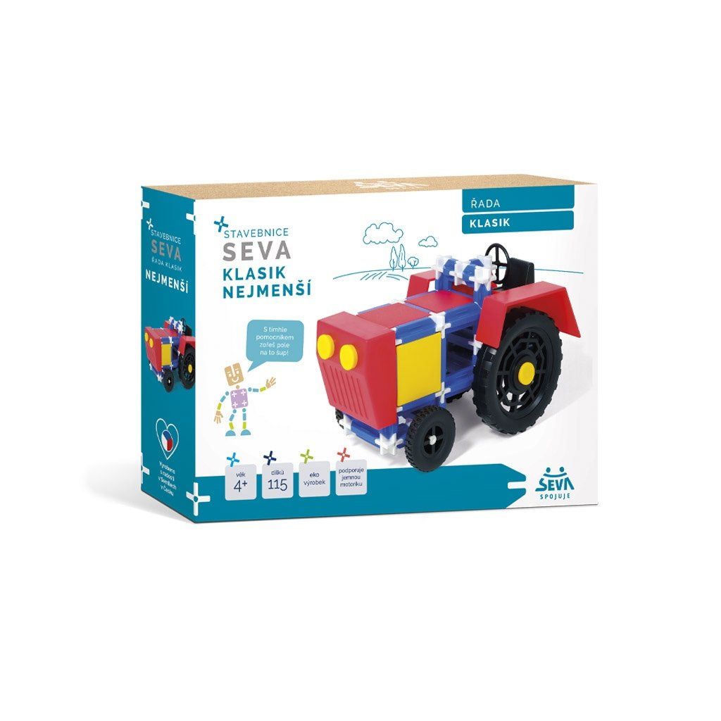 Stavebnice SEVA KLASIK - Nejmenší obsahuje 115 dílků, ze kterých si můžete sestavit originální traktor podle přiloženého návodu nebo podle své vlastní fantazie. Bestseller značky SEVA – originální traktor, je koncipován pro ty nejmenší stavitele. Nyní jej naleznete v novém, moderním obalu pod značkou SEVA KLASIK. Traktor je v pestrých barvách, které vždy zaujmou jak chlapce, tak dívky. Z této stavebnice lze díky unikátním dílkům sestavit originální traktor a nejen to. Co všechno dokážete ještě postavit, záleží jen na Vás a na Vaší fantazii! V balení naleznete také praktický návod, díky kterému bude sestavení traktoru pro Vaše ratolesti úplná hračka. Navíc si děti budou rozvíjet technické myšlení a kdo ví, možná se jim bude právě tato schopnost v životě jednou hodit…Doplňkové parametry