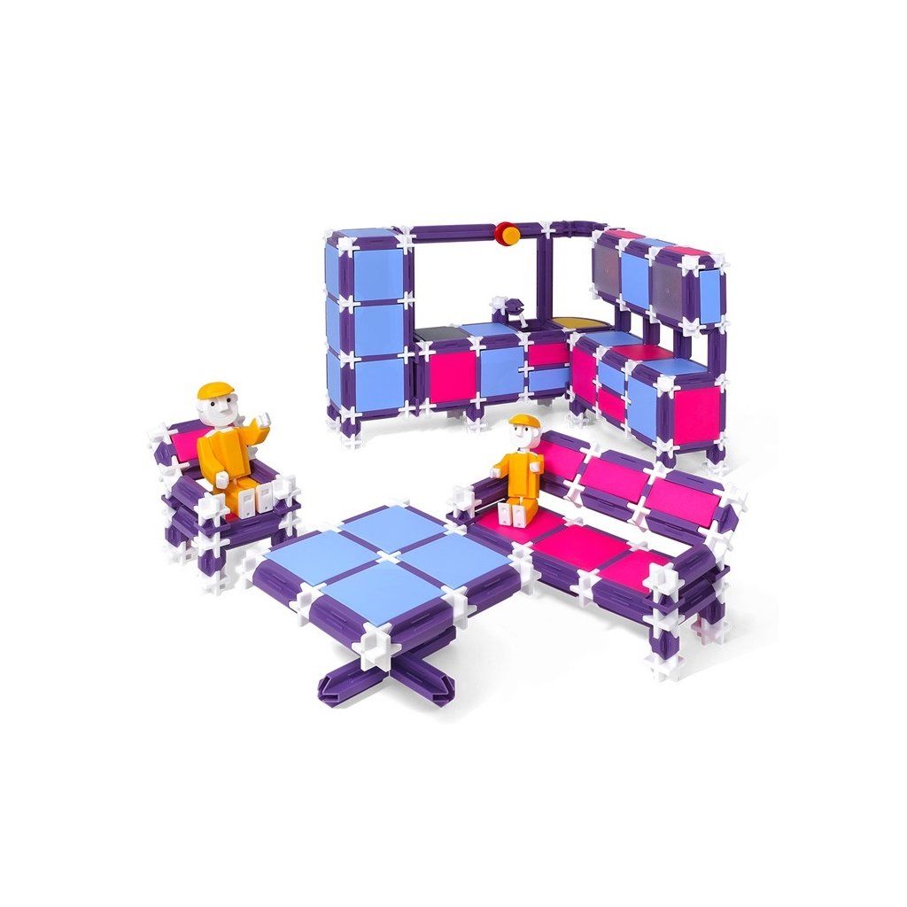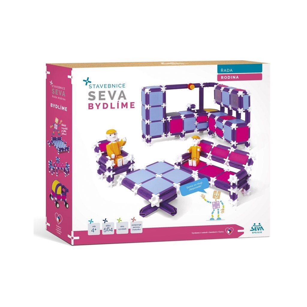 Stavebnice SEVA RODINA - Bydlíme obsahuje 564 dílků, ze kterých si můžete sestavit např. kuchyň, ložnici, obývací pokoj, kočárek, panáčky Seváčky, atd.