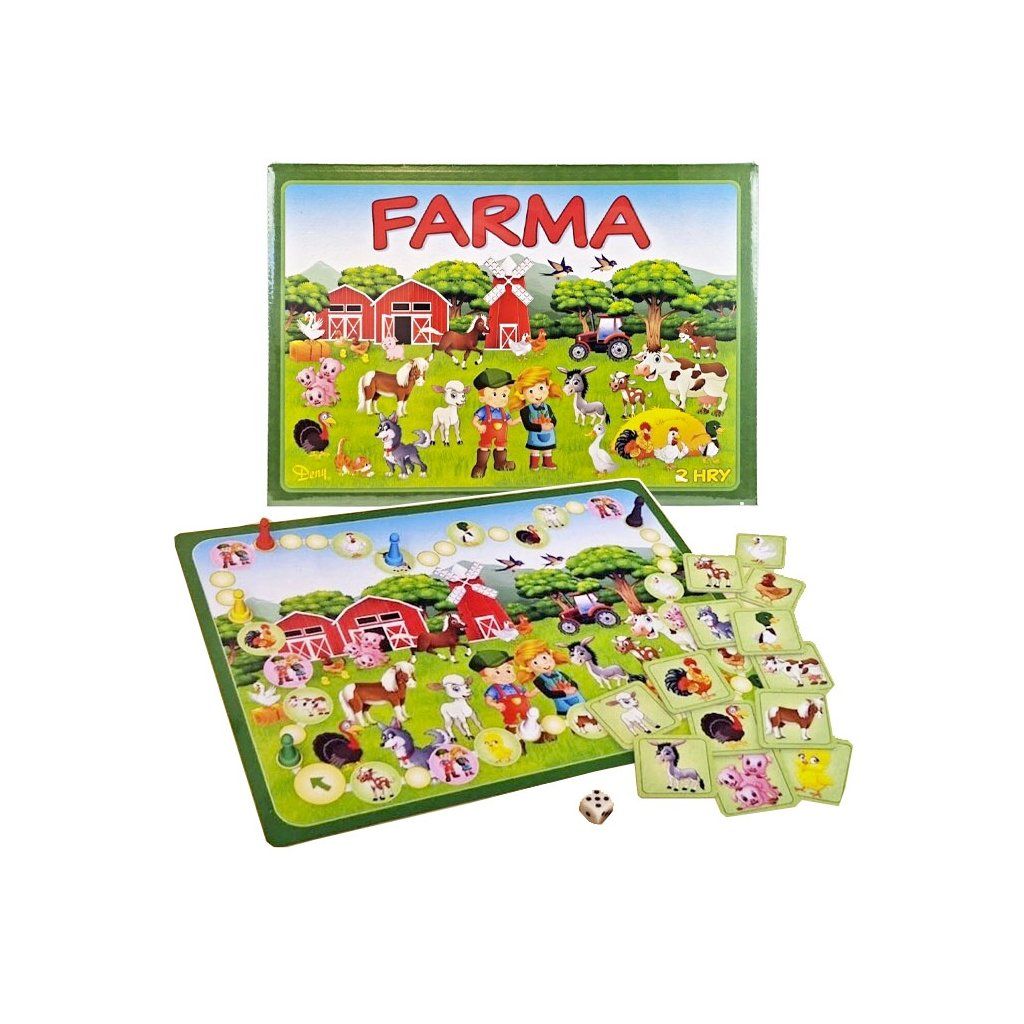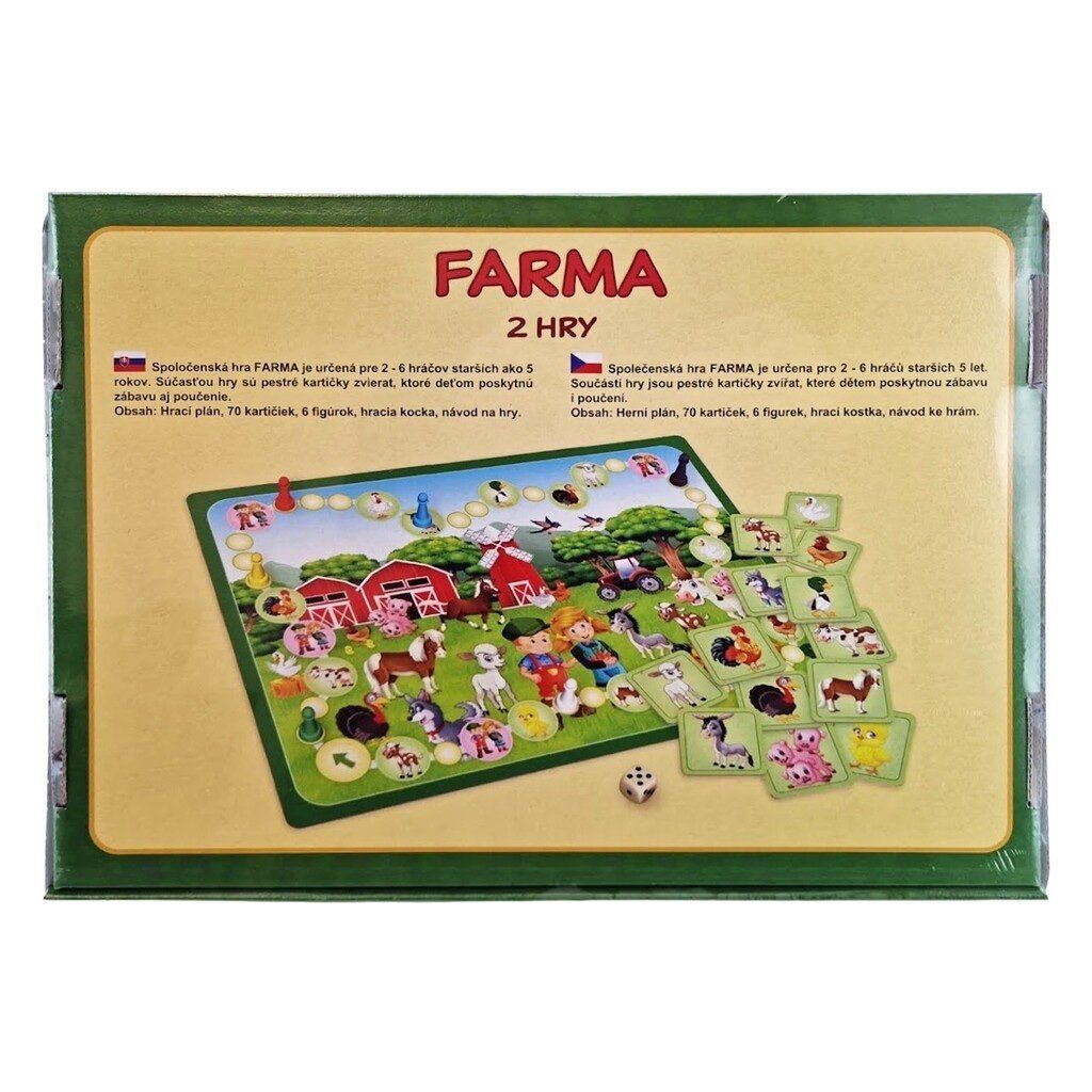 Společenská hra Farma je určena pro 2 - 6 hráčů starších 5 let. Součástí hry jsou pestré kartičky se zvířátky, které dětem poskytnou zábavu i poučení. Obsah balení: Hrací plán, 70 kartiček, 6 figurek, hrací kostka, návod na hryDoplňkové parametry