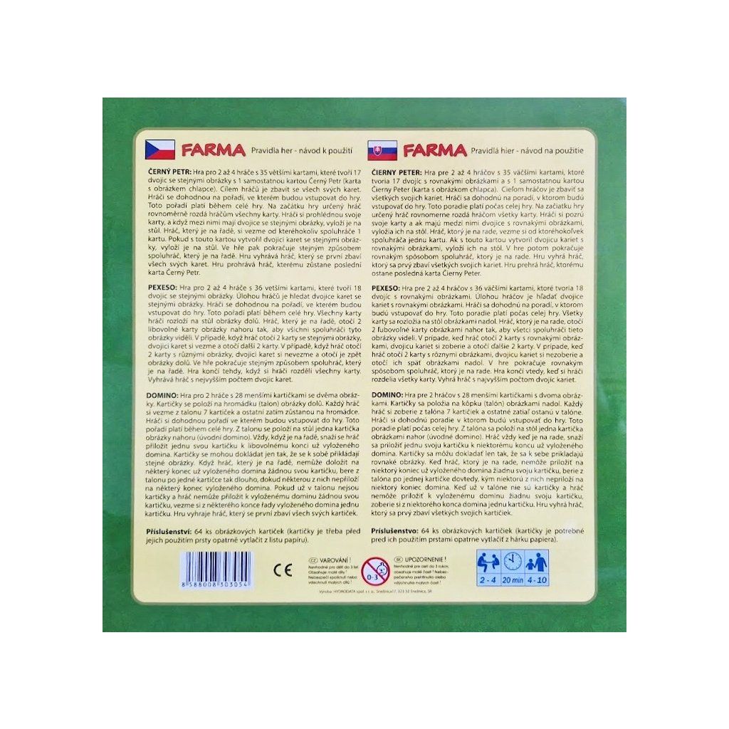 Soubor společenských her pro malé i velké. Typické hry, které zabavají už desetiletí a které nikdy neomrzí. 1hra - Černý Peter: Hra pro 2 až 4 hráče s 35 většími kartičkami, které tvoří 17 dvojic a 1 samostatnou kartu Černý Peter 2hra - Pexeso: Hra pro 2 až 4 hráče s 36 většími kartami, které tvoří 18 dvojic s rovnými obrázky 3hra - Domino: Hra pro 2 hráče s 28 kartičkami se dvěma obrázky.Doplňkové parametry