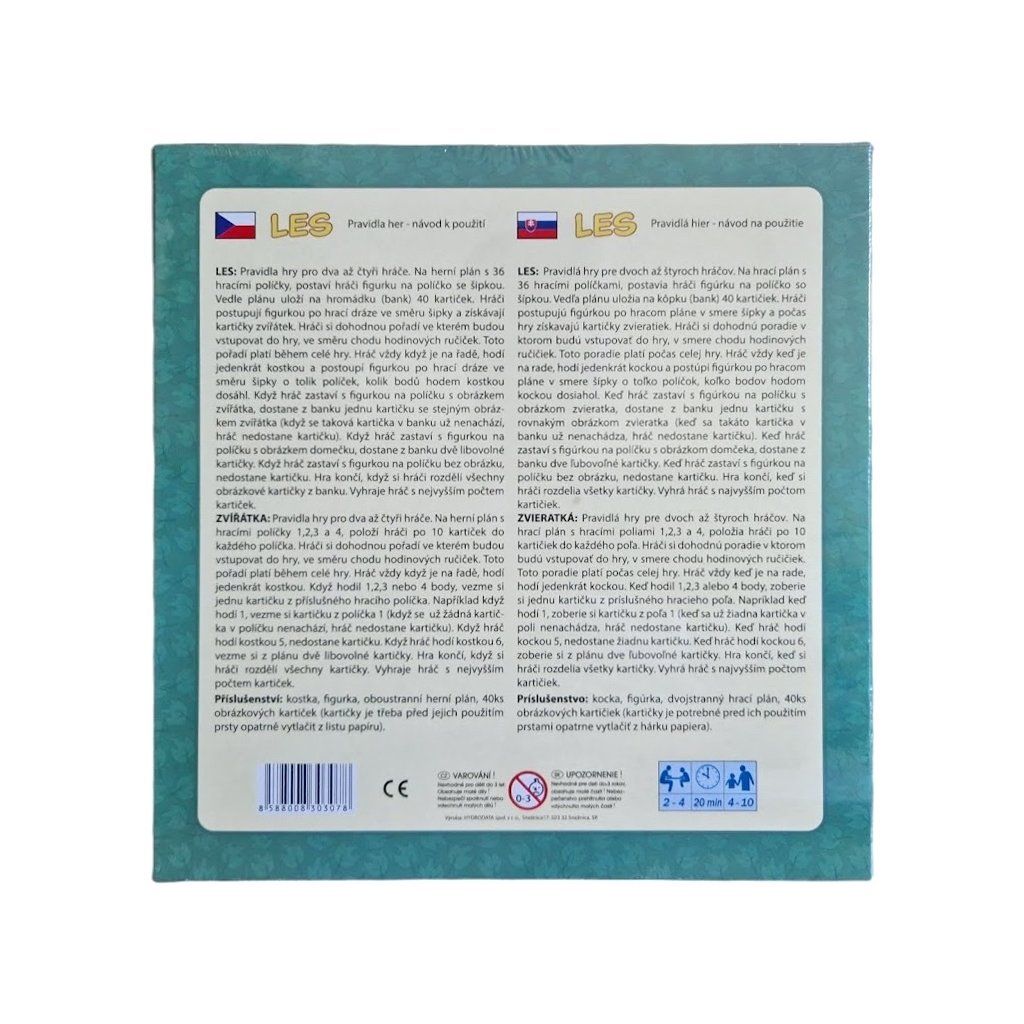 Společenská hra Les 2-hry Soubor společenských her pro malé i velké. Typické hry, které zabavají už desetiletí a které nikdy neomrzí. Hra 1 - Les: Pro 2 až 4 hráče. Na hrací plán s 36 hracími políčky, postaví hráči figurku na políčko se šipkou. Vedle plánu uloží na hromádku (bank) 40 kartiček. Hra 2 - Zvířátka: Pro 2 až 4 hráče. Na hrací plán s hracími poli 1,2,3 a 4, položí hráči po 10 kartiček do každého pole.Doplňkové parametry