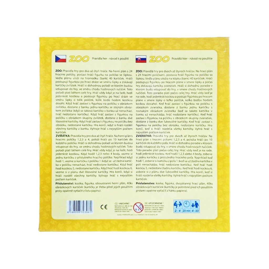 Společenská hra ZOO 2-hry Soubor společenských her pro malé i velké. Typické hry, které zabavají už desetiletí a které nikdy neomrzí. 1hra - ZOO: Pro 2 až 4 hráče. Na hrací plán s 24 hracími políčky, postaví hráči figurku na políčko se šipkou. Vedle plánu uloží na hromádku (bank) 40 kartiček. 2hra - Zvířátka: Pro 2 až 4 hráče. Na hrací plán s hracími poli 1,2,3 a 4, položí hráči po 10 kartiček do každého pole.Doplňkové parametry