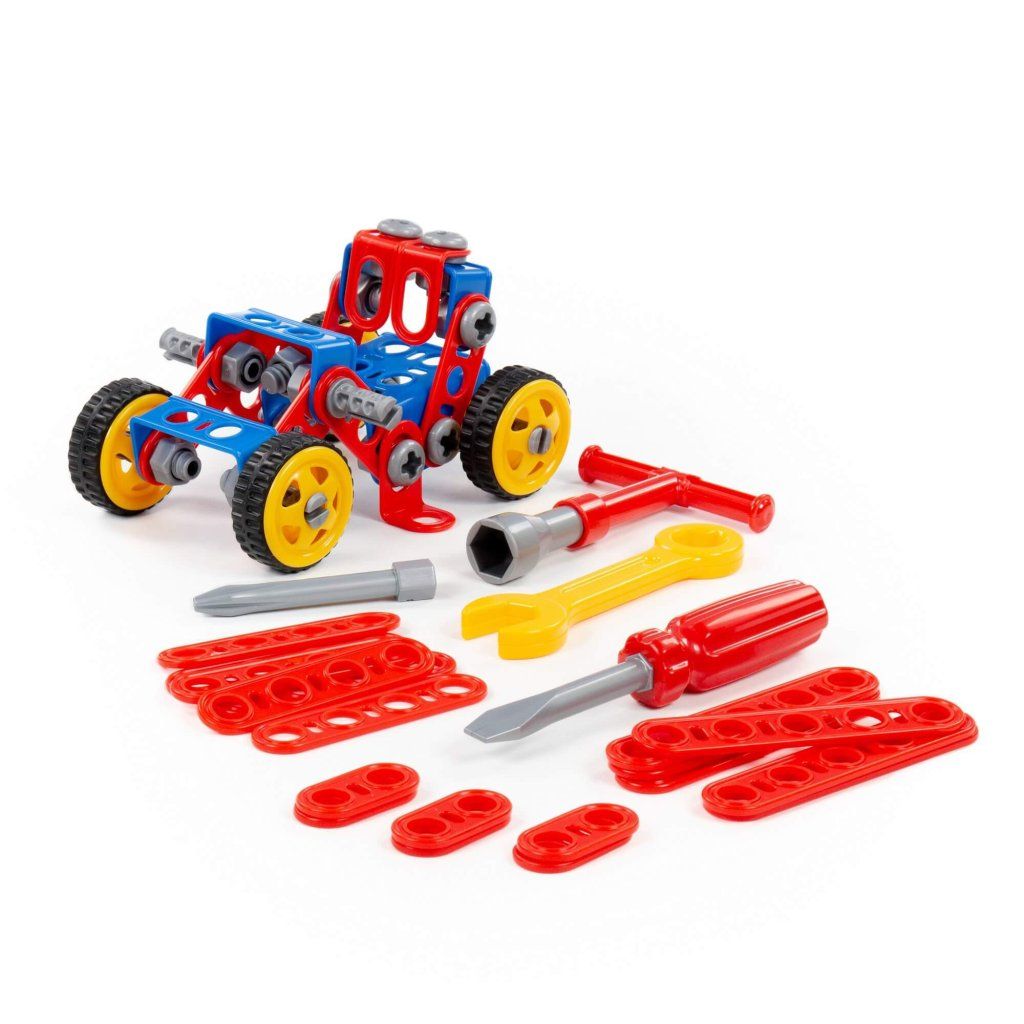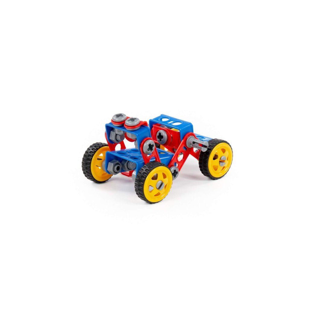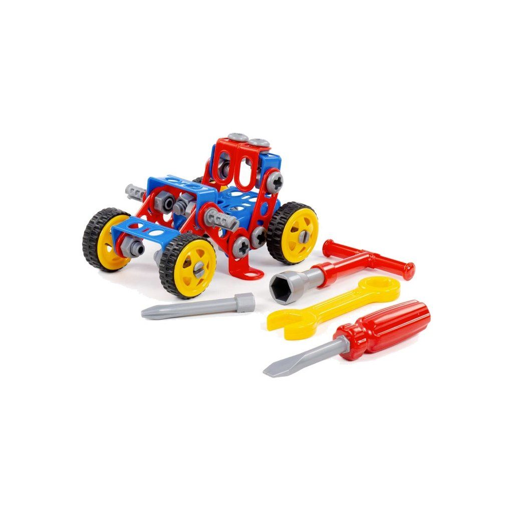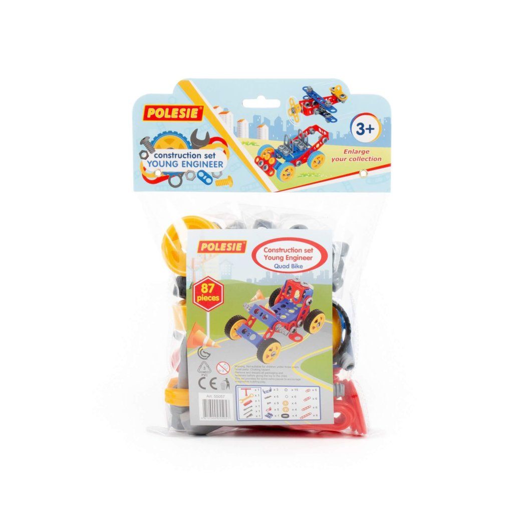 Stavebnice Malý Inženýr 87. V balení je 87 částí na poskládání čtyřkolky, ale i jiného kreativního modelu na kolečkách s gumovou pneumatikou o průměru 5,5 cm. Jednotlivé části se spojují šrouby a maticemi přiloženým nářadím. Hračka podporuje rozvoj jemné motoriky, rozvoj základních technických dovedností a návyků.Doplňkové parametry