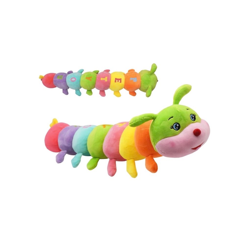 Plyšová 70cm stonožka s vyšitými písmenky. Vhodná také jako dekorace.