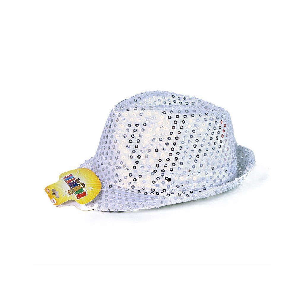 Stříbrný disco klobouk s LED světélky, po zapnutí barevně bliká až 3 rychlostmi a 3 baterie typu LR44 jsou jeho součástí. Má rozměry 28 x 23 cm.