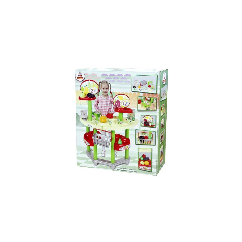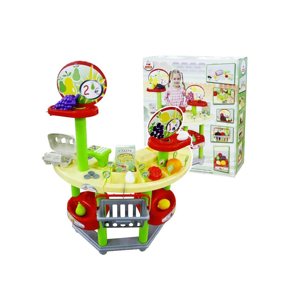 Pult Supermarket je balen v krabici 50 x 56 cm velké. Pult je 87 cm vysoký. Součástí balení jsou i všechny vyobrazené doplňky, ovoce, cenovky kasa, košík, mince apod. Pult byl vyroben ve spolupráci s firmou Palau Toys.Doplňkové parametry