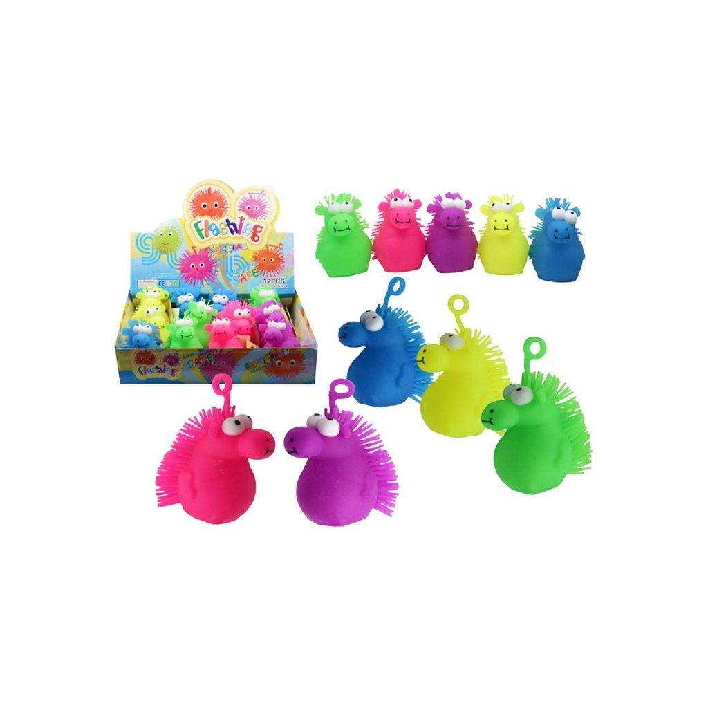 Svítící 10cm natahovací mořský koník. Možnost výběru z pěti barev – žluté, modré, zelené, fialové nebo růžové. Nevhodné pro děti do 3 let.Doplňkové parametry