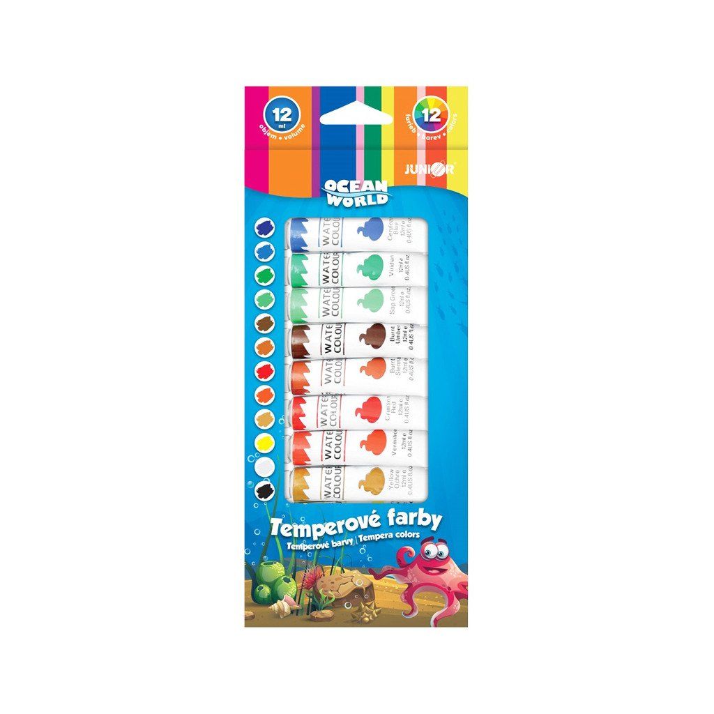 Temperové barvy Ocean World, 12 kusová sada, objem barvy je 12 ml. Cena je za 1 sadu. Vhodné pro děti ve věku 3+ let.Doplňkové parametry