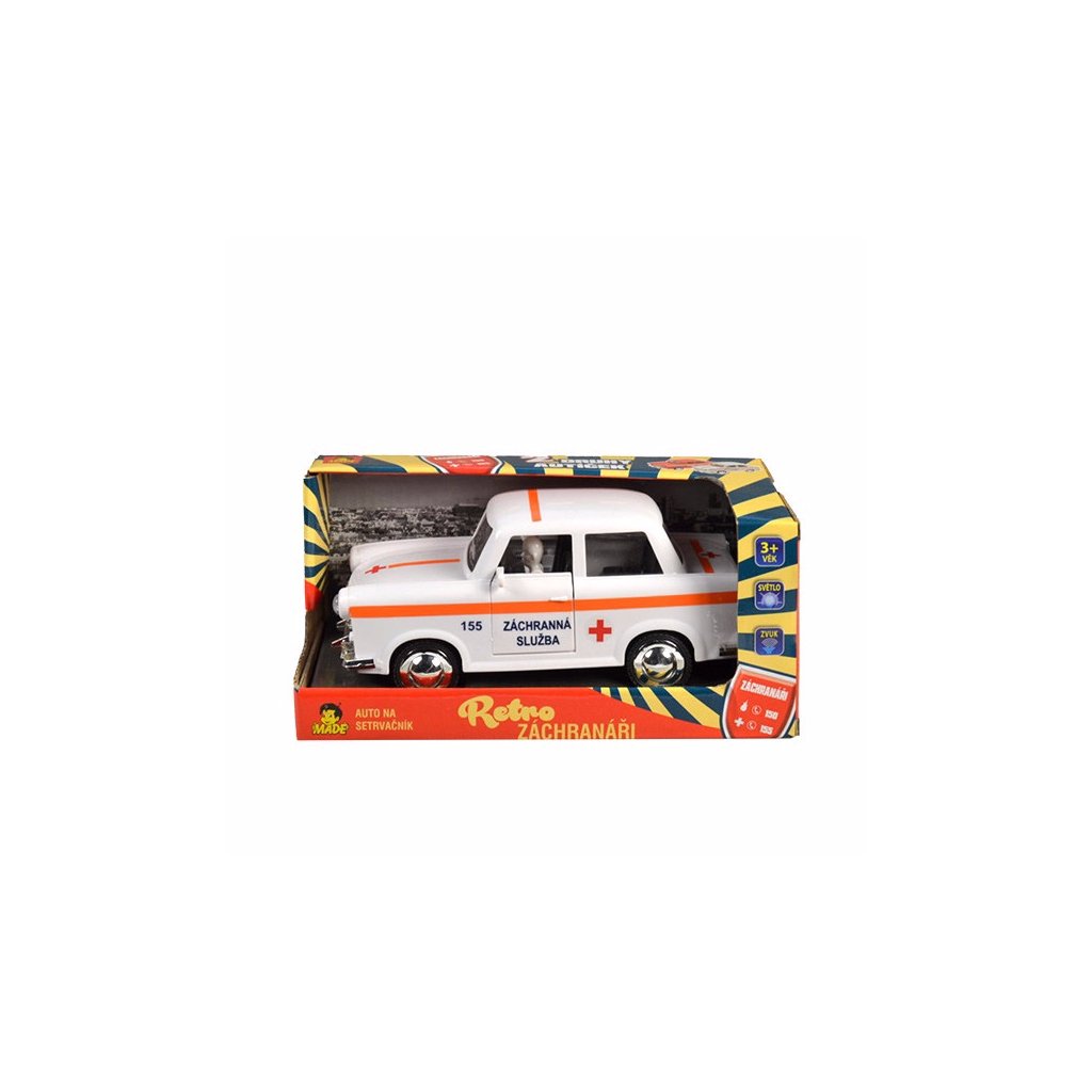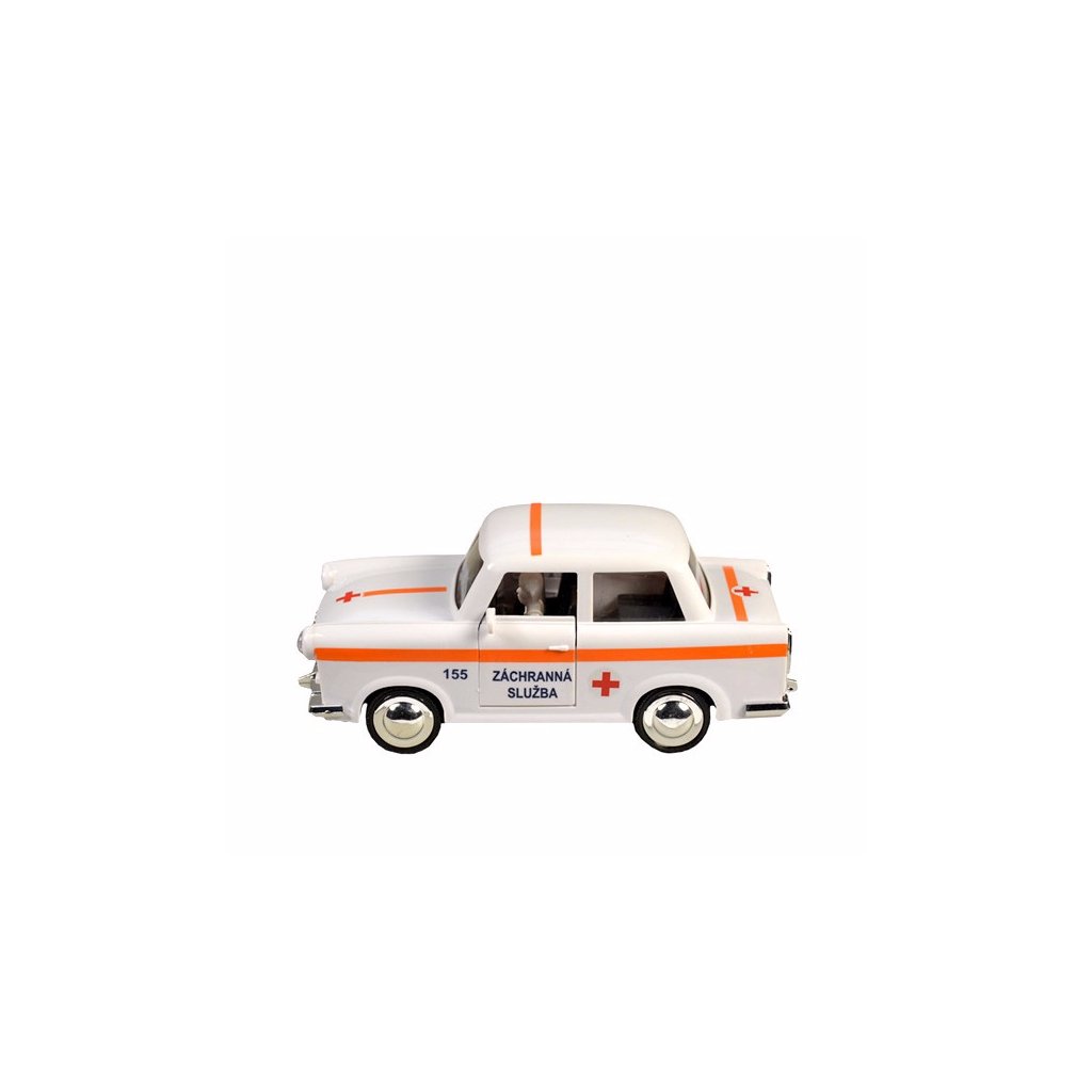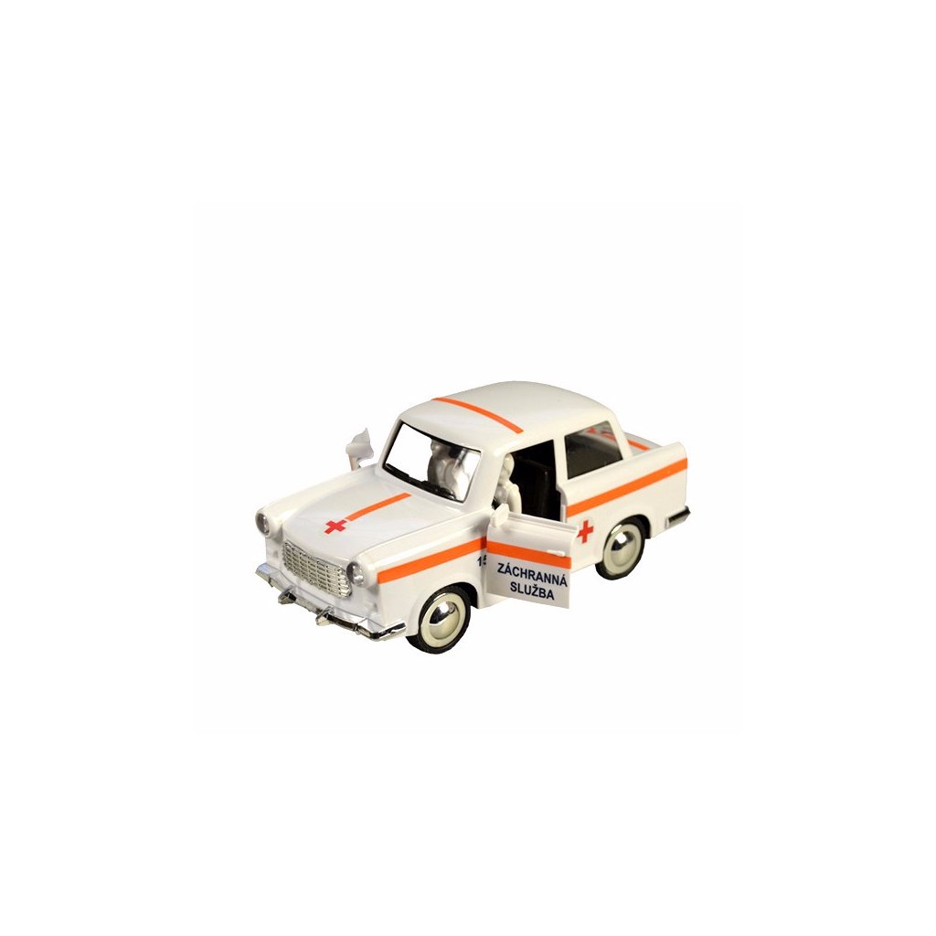 Trabant Záchranářský je 18 cm velký s pohonem na setrvačník s otevíracími dverami.Po vytažení pojistky a stisknutí se rozsvítí přední světla se zvukem startu a chodu motoru.