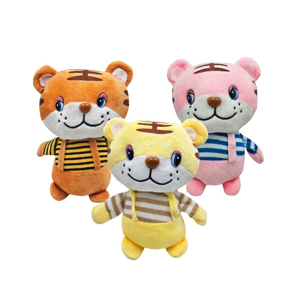 Plyšový 20cm tygřík v kalhotách. Možnost výběru ze tří barev – žlutý, hnědý nebo růžový. Cena za kus.