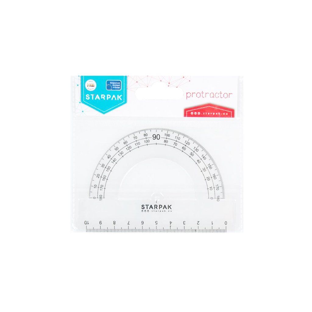 Úhloměr ze sbírky Starpak věnované škole. Úhloměr vyroben z odolného plastu s rozsahem 180 stupňů a pravítko s délkou 10 cm se stupnicí v centimetrech a milimetrech. Potřebné školní potřeby na hodiny matematiky. Určeno pro děti ve věku od 3 let.Doplňkové parametry