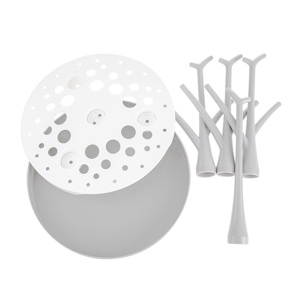Sušička, odkapávač na láhve a příslušenství je ideálním pomocníkem na doma i na cestách. Speciální tvar spodní části byl navržen tak, aby odváděl vodu do jednoho místa a sušička nemusela být umístěna na dřezu. Je vhodná pro všechny typy lahví a dudlíků. Je snadno složitelná, čímž zabírá málo místa a lze jí mýt v myčce.
