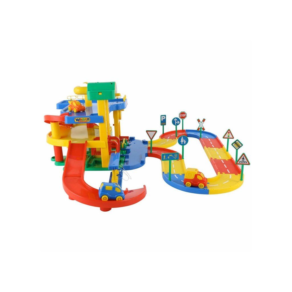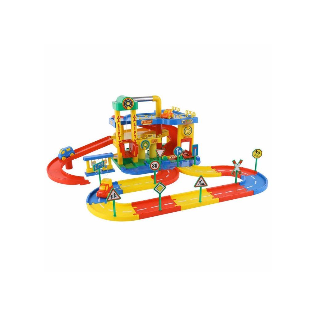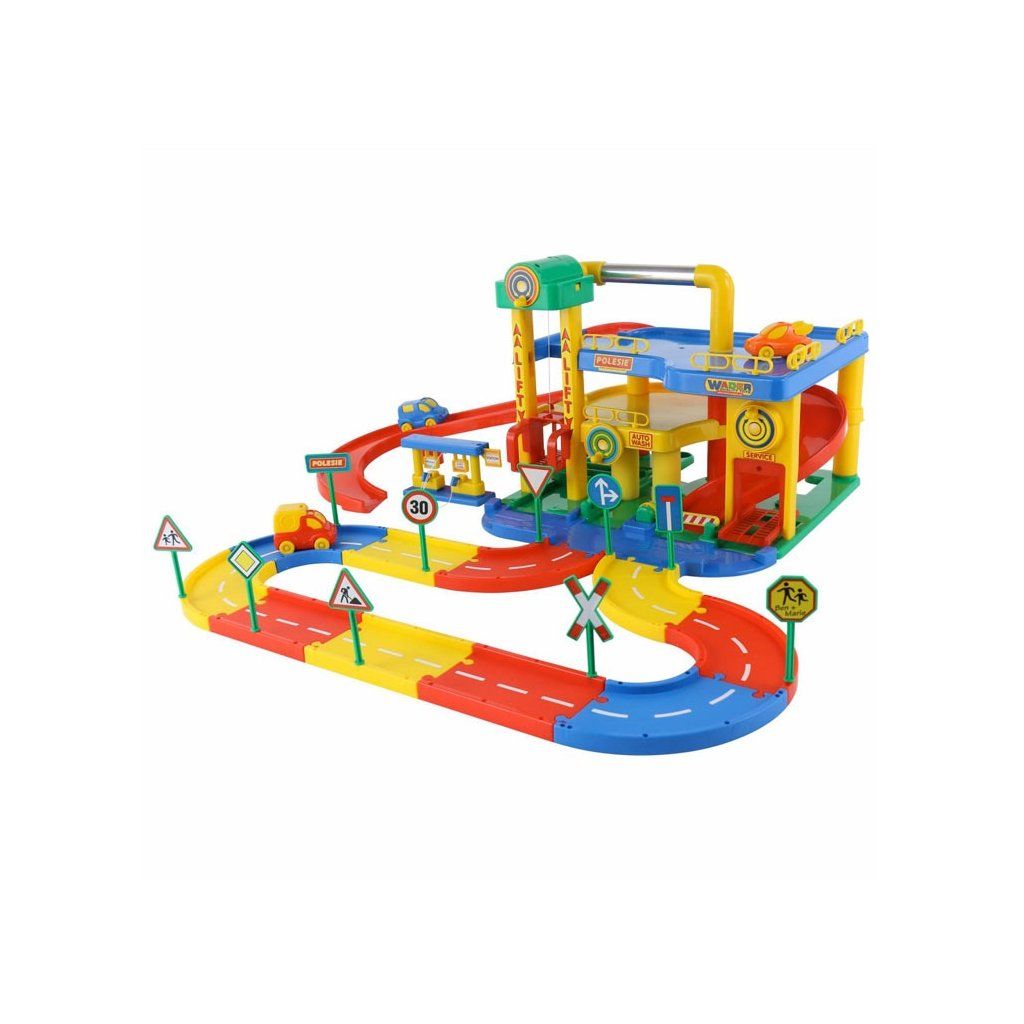 Velká garáž s dráhou a množstvím funkcí - myčka s rotujícími válci, benzínová pumpa, servisní stanice se zvedací plošinou a ani výtah nesmí ve správné garáži chybět. Garáž je možné složit a odnést nebo vzít s sebou na cesty. Součástí garáže jsou 4 autíčka. Garáž s dráhou ma po složení délku 100, šířku 90 a výšku 38 cm. Výrobek je od značky Wader quality toys.Doplňkové parametry