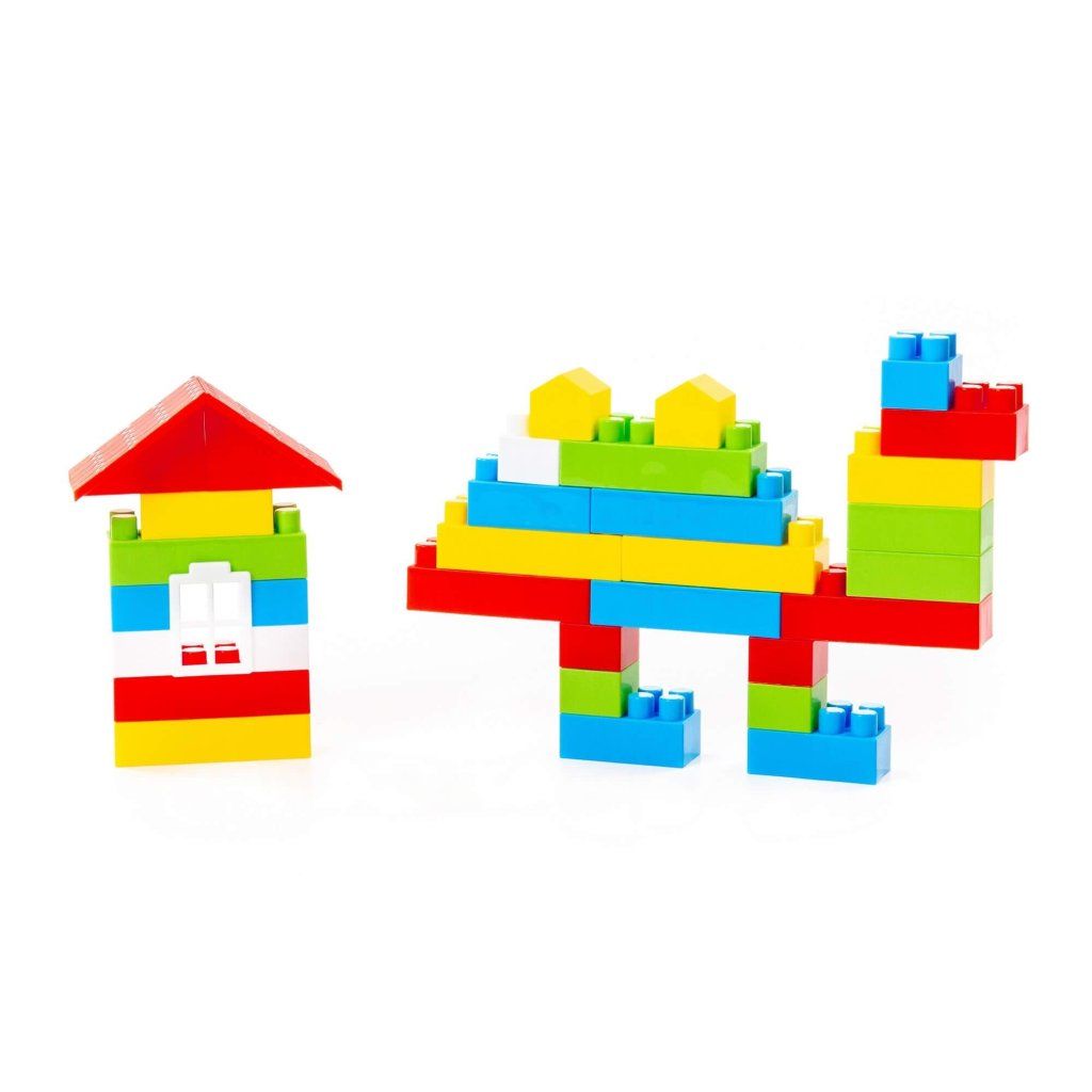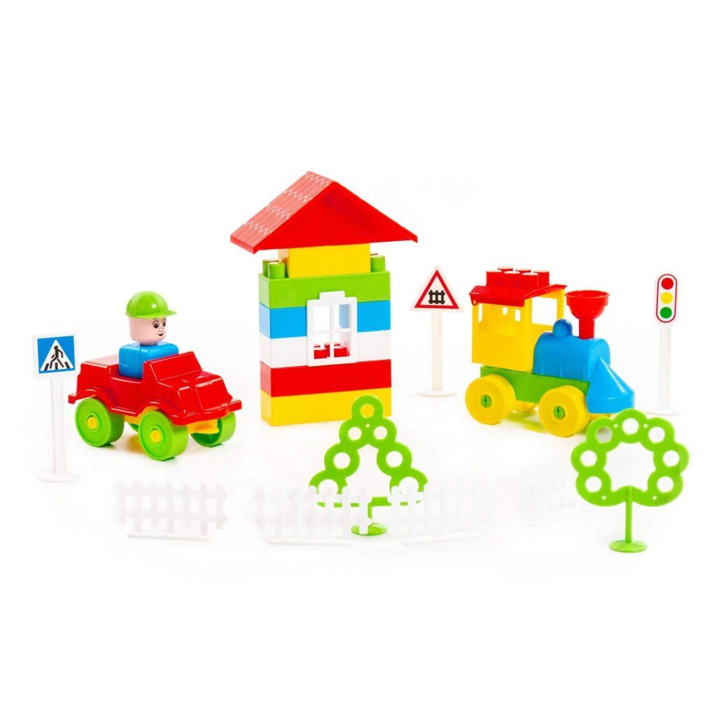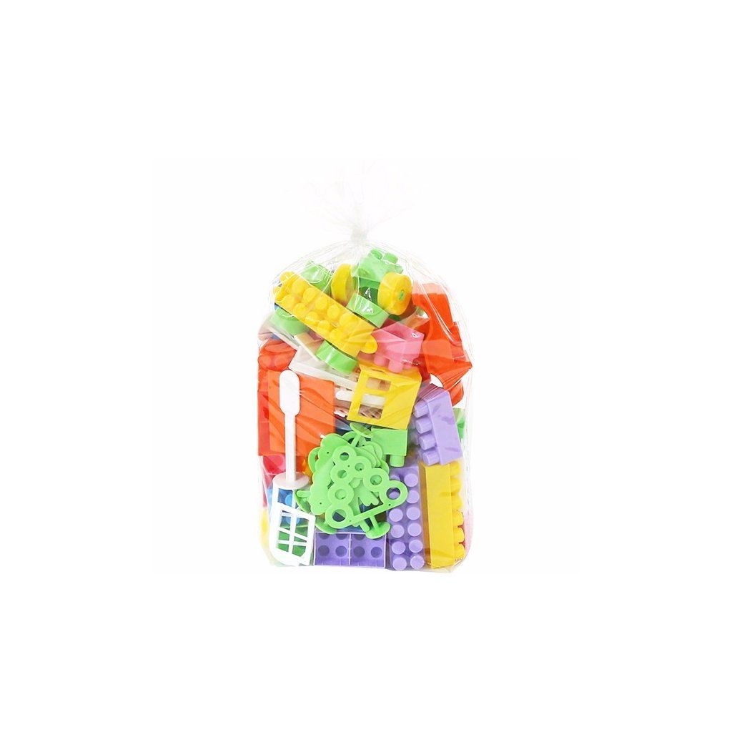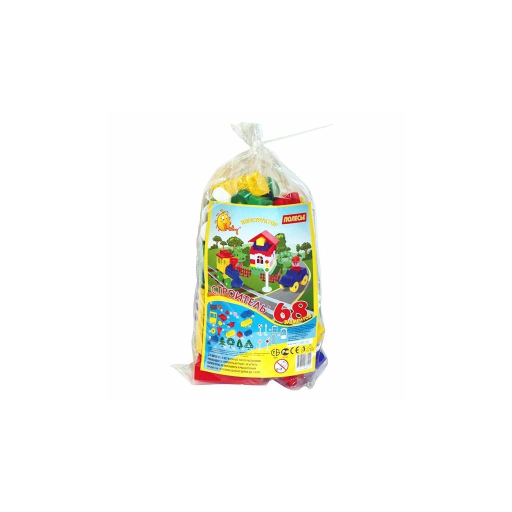 Stavebnice Stavitel 68, ze základních plastových stavebních částí, okna, dveře, kolečka, části na postavení lokomotivy, 68 dílů. Rozměr základního dílu je 3 x 3 cm.Doplňkové parametry