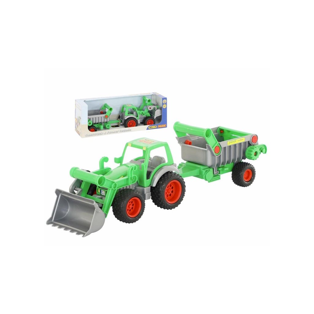 Traktor Farmář s lopatou a návěsem na gumových pneumatikách, mechanicky ovládané zvedání korby návěsu s výklopným zadním čelem, s podpěrou návěsu, mechanické zvedání a vysypávání lopaty traktoru se zajištěním vysypávání. Hračka je certifikována pro děti od 1 roku věku od renomované značky Wader quality toys. Barevné kombinace konzultujte dle aktuálního stavu na skladě.Doplňkové parametry