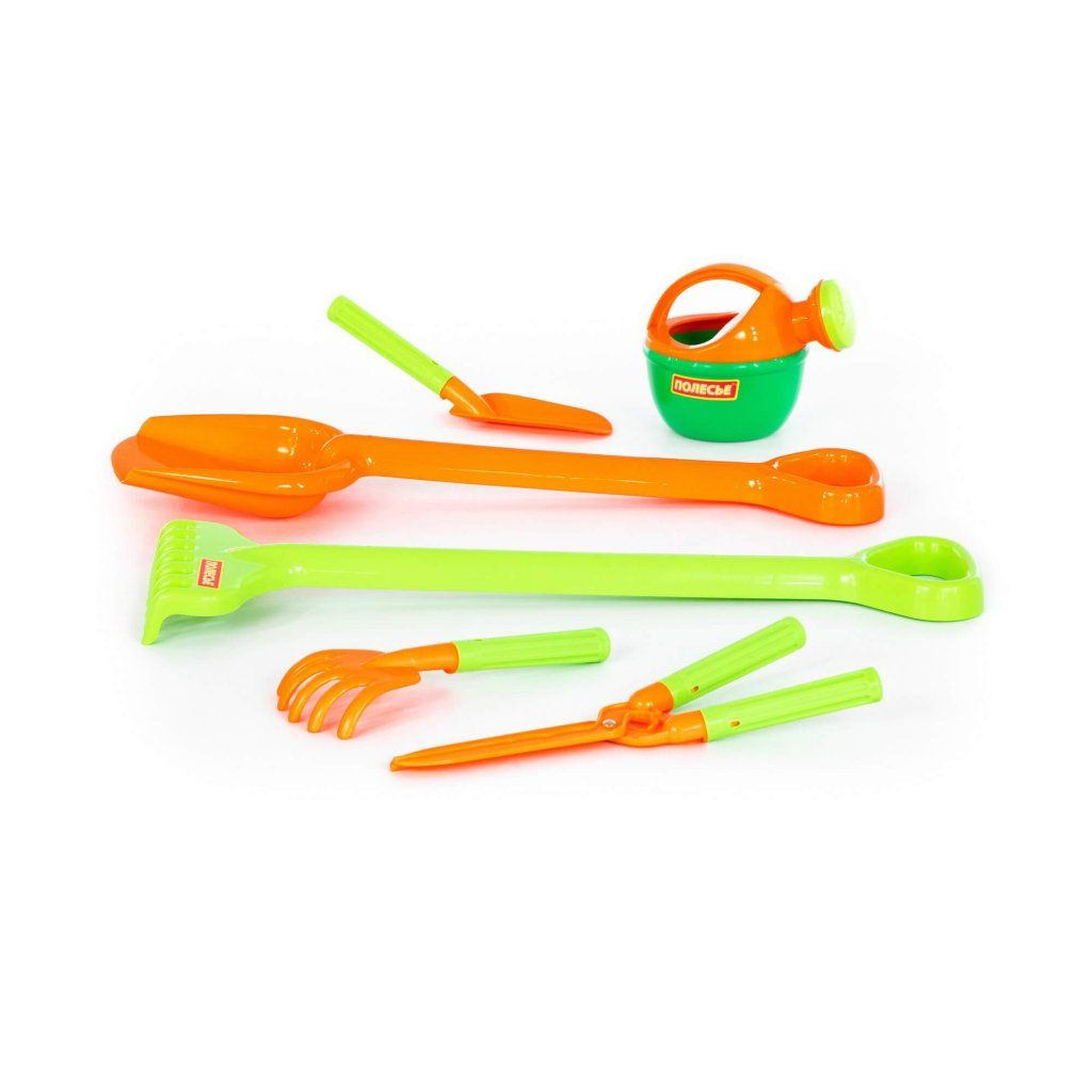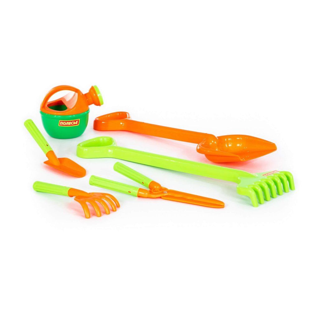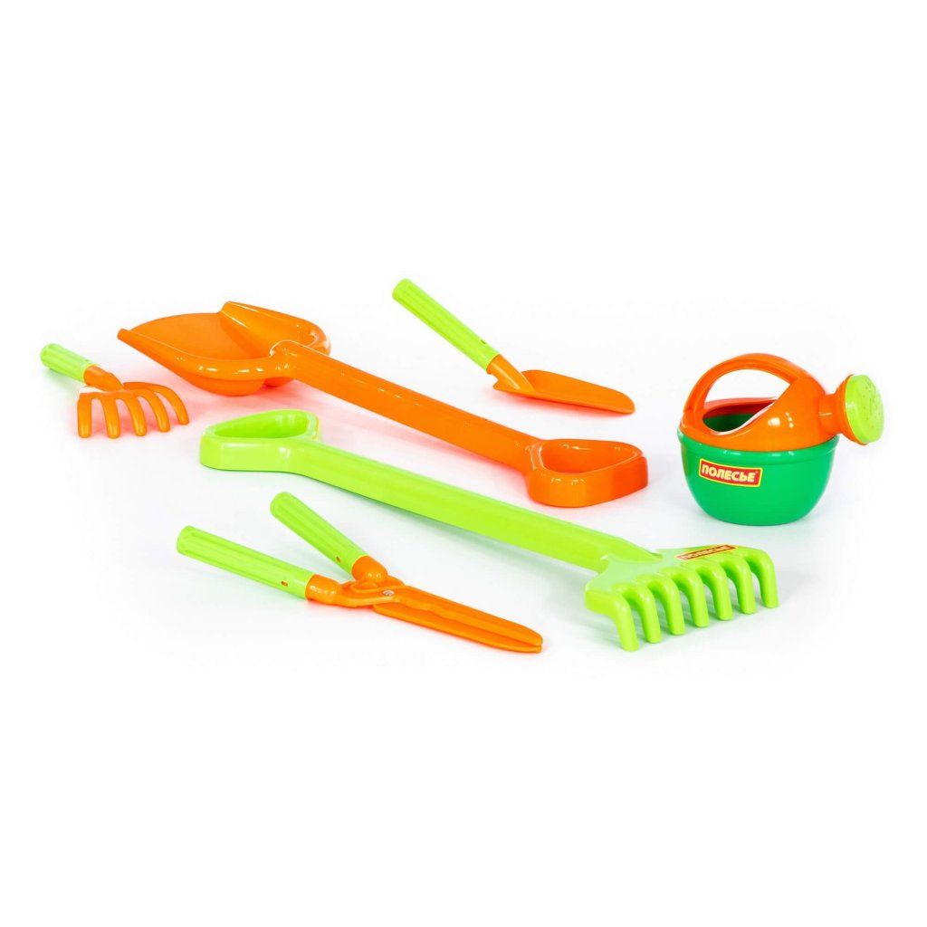 Sada zahrádkář obsahuje: Velká lopata, velké hrábě, lopatka, hrábě, zahradnické nůžky, malá krhlička