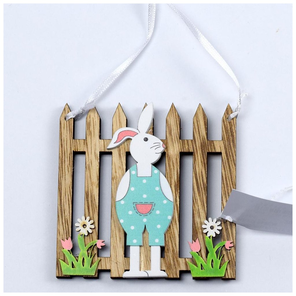 Cena za 1 ks: 24, ZAJÍC PŘI PLOTU ZÁVES DŘEVO 9x9CM
