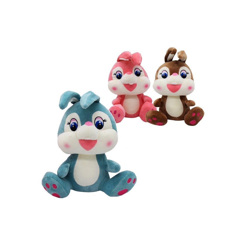 Plyšový 45cm sedící zajíček s ohebnými oušky. Možnost výběru ze tří barev – modrý, hnědý nebo růžový.