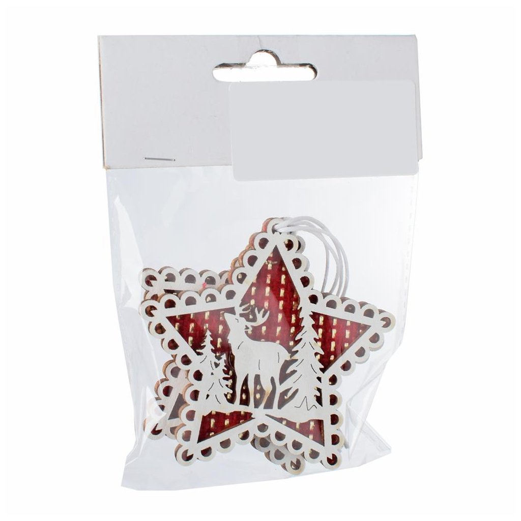 Cena za 1 ks: 37, ZÁVES HVIEZDA S JELEŇOM V SÁČKU DREVO BIELA S/2 10x13CMDoplňkové parametry