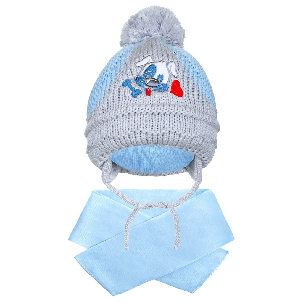 Nádherná zimní pletená čepička New Baby. Čepičku zdobí nádherný obrázek pejska. Má zavazovací tkaničky, úpletovou podšívku a roztomilou bambulku. Složení 100% bavlna. Čepička je vhodná pro zimní dny. Ideálni pro malé i větší děti. Čepička je tvarovaná tak, aby kryla ouška. Obvod kolem hlavičky 44-48 cm. Šála: rozměr: cca 96 cm.Doplňkové parametry